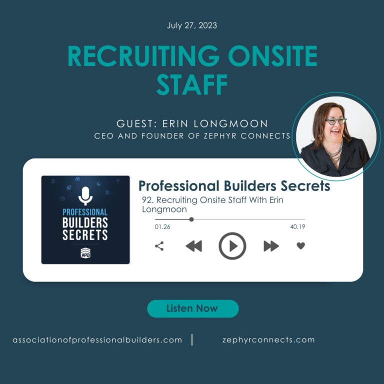 Professional Builders Secrets brings you an exclusive episode with the CEO of Zephyr Connects®, Erin Longmoon. In this episode, Erin unpacks the common pitfalls builders face when recruiting onsite staff, and the strategies you can implement to ensure you hire the best staff for your building company.